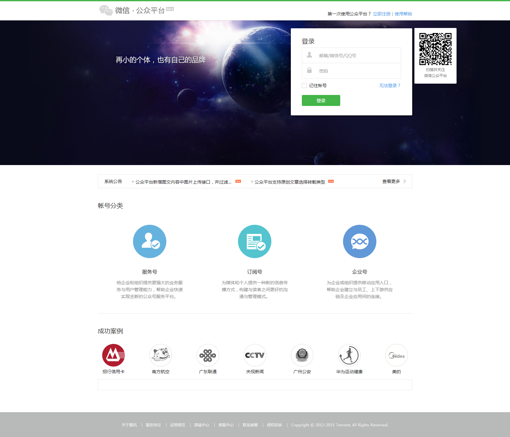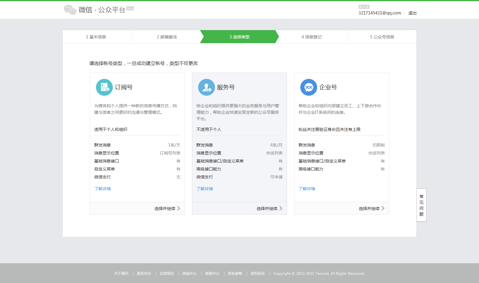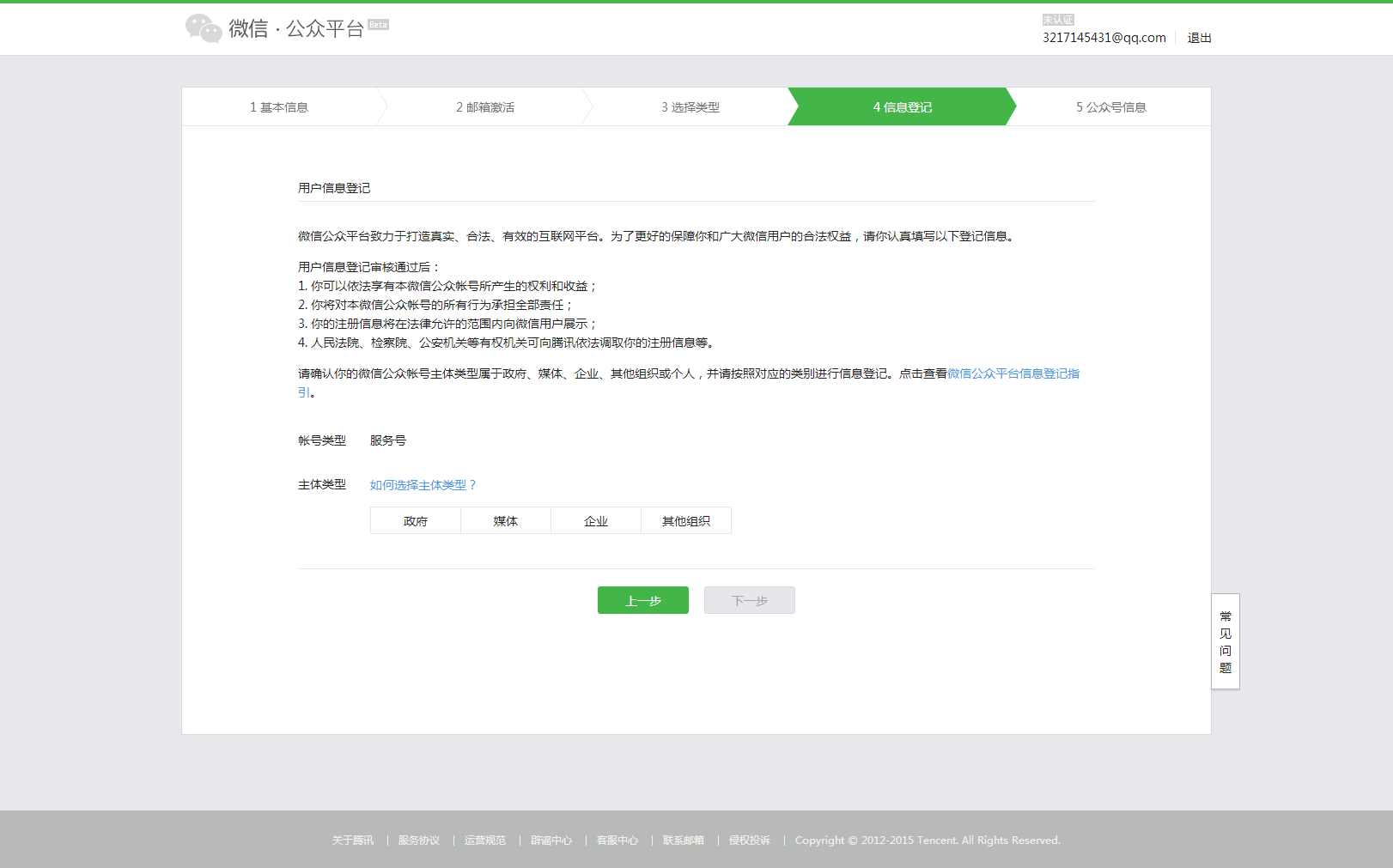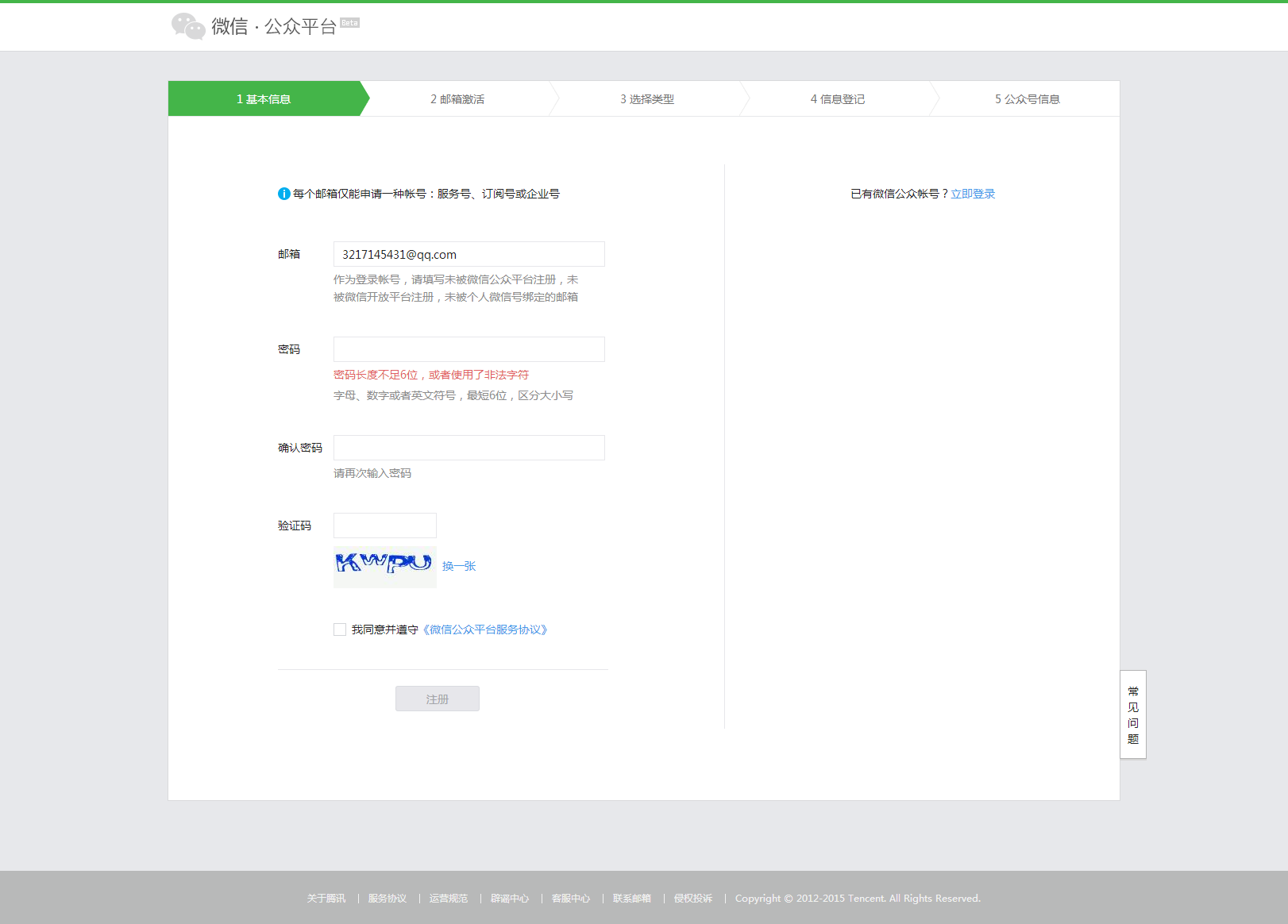 2、注冊過QQ賬號以后,登錄到https://mp.weixin.qq.com/的頁面,進行企業微信服務號的注冊。如圖:
