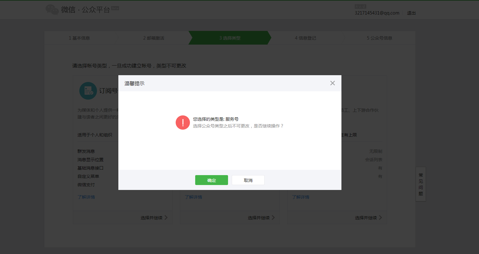 不管是選擇服務號還是訂閱號只能有一次選擇的機會,選擇過后就不能進行修改,當您選擇過后會彈出一個窗口,如圖: