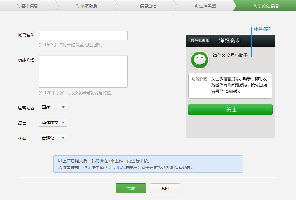 8、我們點擊“繼續”后,就直接到了“公眾號信息”選項卡里面,在這里我們要輸入帳號名稱、功能介紹、地區等信息認真填寫,在功能欄里一本是填寫企業簡介。帳號名稱也只有一次機會,確定后是不能更改的。所有填寫完成后,我們直接點擊“完成”。如下圖所示: