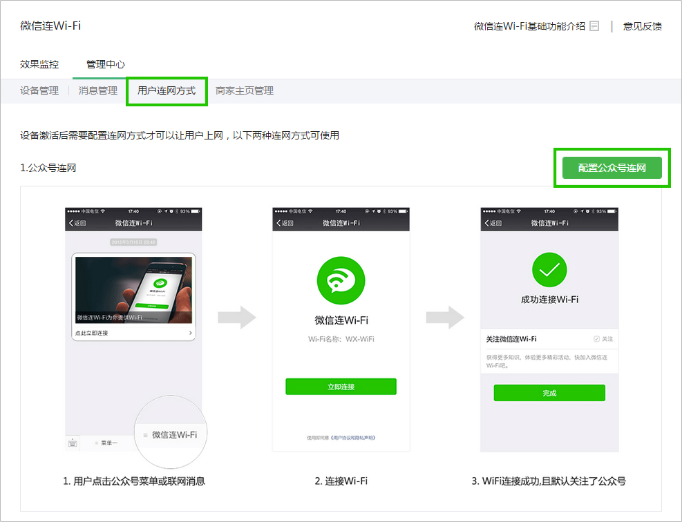 2、選擇“用戶(hù)連網(wǎng)方式”,然后點(diǎn)擊“配置公眾號(hào)連網(wǎng)”: