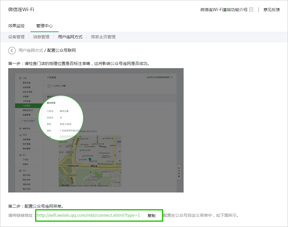 A:支持配置到多家門(mén)店。請(qǐng)?jiān)诠娖脚_(tái)準(zhǔn)確設(shè)置各家門(mén)店的地址位置和對(duì)應(yīng)的所有網(wǎng)絡(luò)設(shè)備信息,到店顧客點(diǎn)擊微信連WiFi菜單時(shí)、微信后臺(tái)即開(kāi)始檢測(cè)此門(mén)店的網(wǎng)絡(luò)信號(hào)、并結(jié)合門(mén)店在公眾平臺(tái)配置的地理位置等相關(guān)信息、幫助顧客自動(dòng)連接到店里WiFi。