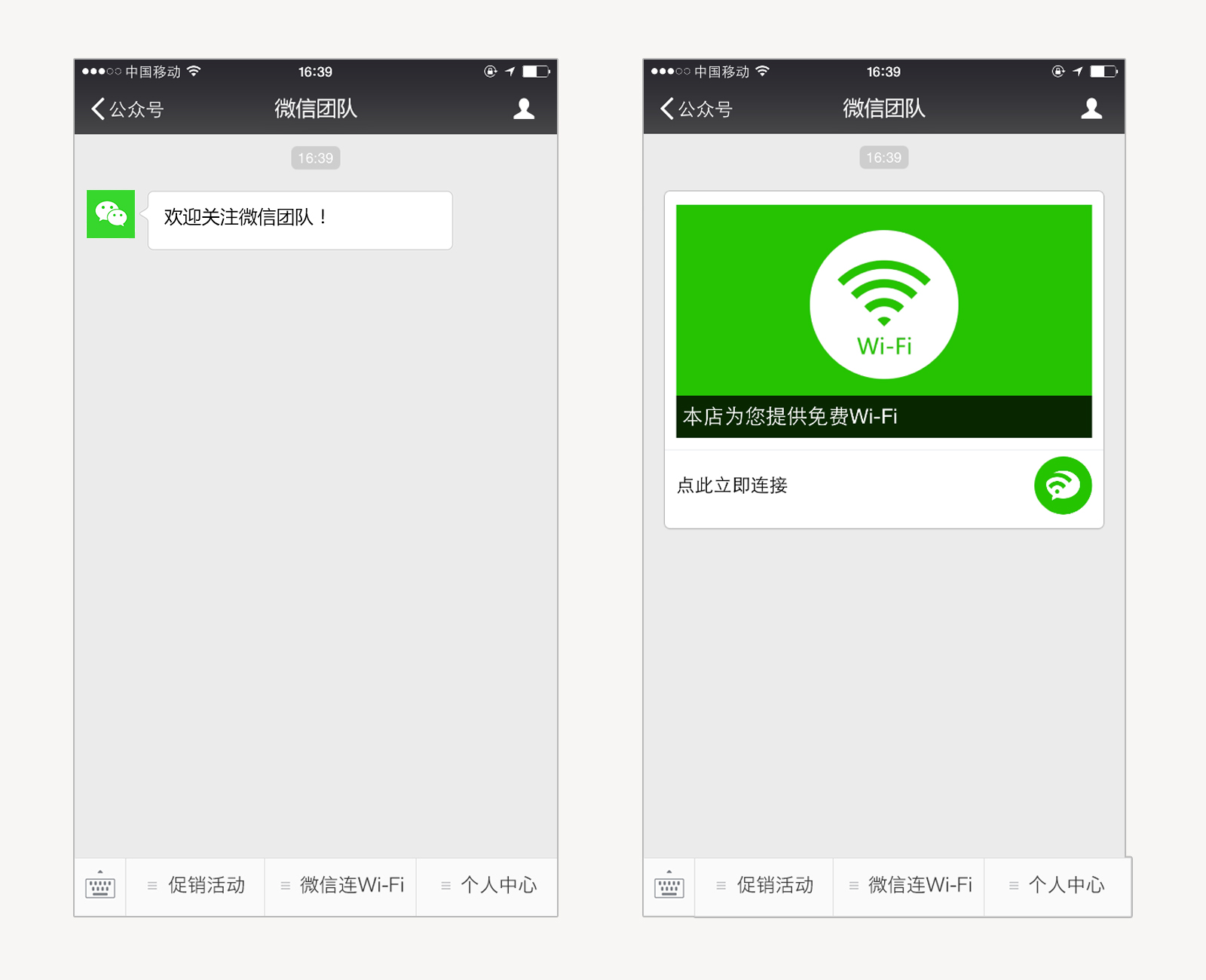 A:顧客關(guān)注此公眾號(hào)后,有兩種方法連上Wi-Fi:1.點(diǎn)擊公眾號(hào) “微信連Wi-Fi” 菜單,一鍵連接Wi-Fi;2.打開(kāi)公眾號(hào)時(shí),微信后臺(tái)會(huì)自動(dòng)定位和檢測(cè)Wi-Fi信號(hào),同時(shí)下發(fā)連網(wǎng)消息,點(diǎn)擊消息即可連接Wi-Fi。