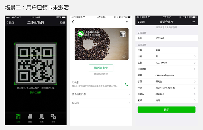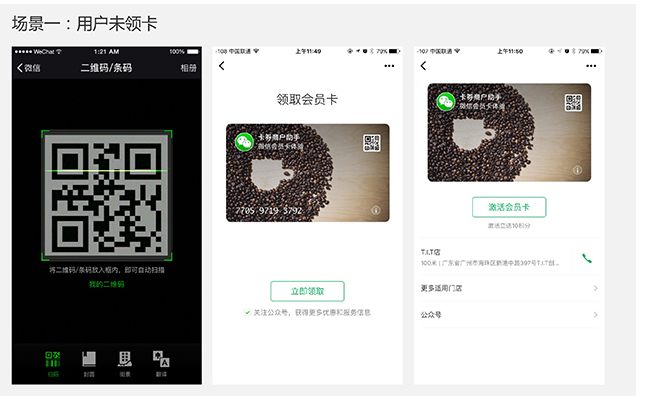 新版會員卡將多種功能集合在一個二維碼上:未領卡用戶掃碼后,領取頁面將默認勾選關注公眾號選項,用戶點擊立即領取后,將在領卡同時關注商家公眾號;領卡未激活用戶掃碼后引導激活;已領卡并激活的會員用戶掃碼可直達卡面,進行支付、查看積分等商家設置的操作。