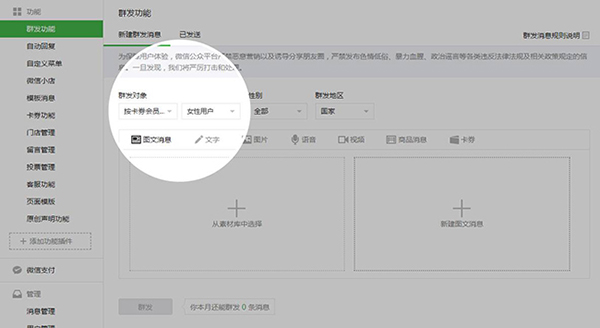 商家可以根據自身需求,在會員管理頁面為會員添加自定義標簽,群發消息時,可選擇指定的會員標簽定向群發。注意,會員需關注公眾號才能收到商家群發的消息。