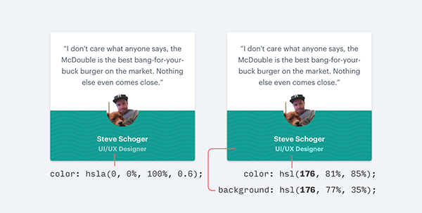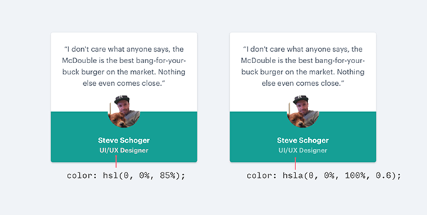 在白色背景下,合理的淡化視覺效果的做法是將黑色文本改成灰色,但這種方式在 彩色背景下并不適用。實際上,在白色背景下文本由黑變灰是為了降低對比度,但在彩色背景下,想要降低對比度是應該讓文本逐步接近背景色,而并非改成灰色,若想要降低和背景色之間的對比,通常采用如下方式:
