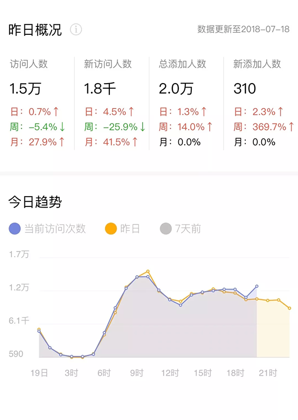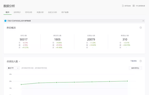 在微信最新版客戶端中,用戶可將使用過的小程序添加為「我的小程序」。已面向開發者提供「我的小程序」添加數據,小程序開發者可登錄微信公眾平臺或使用小程序數據助手,查看相關數據詳情: