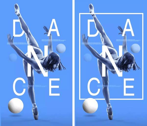 從左到右只是有無線框的差距,但在視覺上卻有形成了很大的反差,左側無線框元素的海報,給人的感覺是:視覺元素不夠整體化,而且因為視覺元素多且沒有形成很好的相互約束作用,反而有點雜亂;而右側僅僅通過添加一個線框元素,將眾多元素規為一個整體,劃定視覺范圍,使得畫面整體性提升了很多,而且看似元素很多,但是正是因為線框的約束能力,畫面非但沒有雜亂的感覺,反而相對左側畫面整體來看給人的感覺更加整齊!