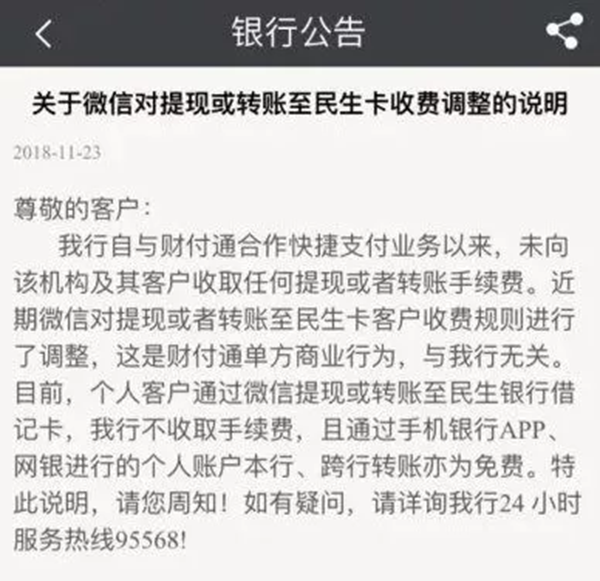 近日微信發布了一則公告稱:自2018年12月18日開始,民生銀行卡體現和轉賬將在加收0.05%手續費,對此,民生銀行發布公告稱:收費為財付通單方面行為,與民生銀行無關……吃瓜群眾表示:和誰有關都不想付啊……