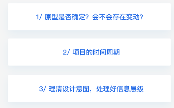 當接到產品經理給的原型稿后,首先要和對方確定收到需求是否完整,是不是最終稿還會不會改動。通常大型企業流程都比較規范,產品經理給的基本上都是最終原型,后期幾乎不會有變動,但小型企業卻不一樣,往往會因為項目時間緊張,流程不夠完善,后期修改的可能性很大。另外,還有一點,在產品經理給到交互原型時,我們是被動的接受,還是在需求溝通之中也能及時參與?