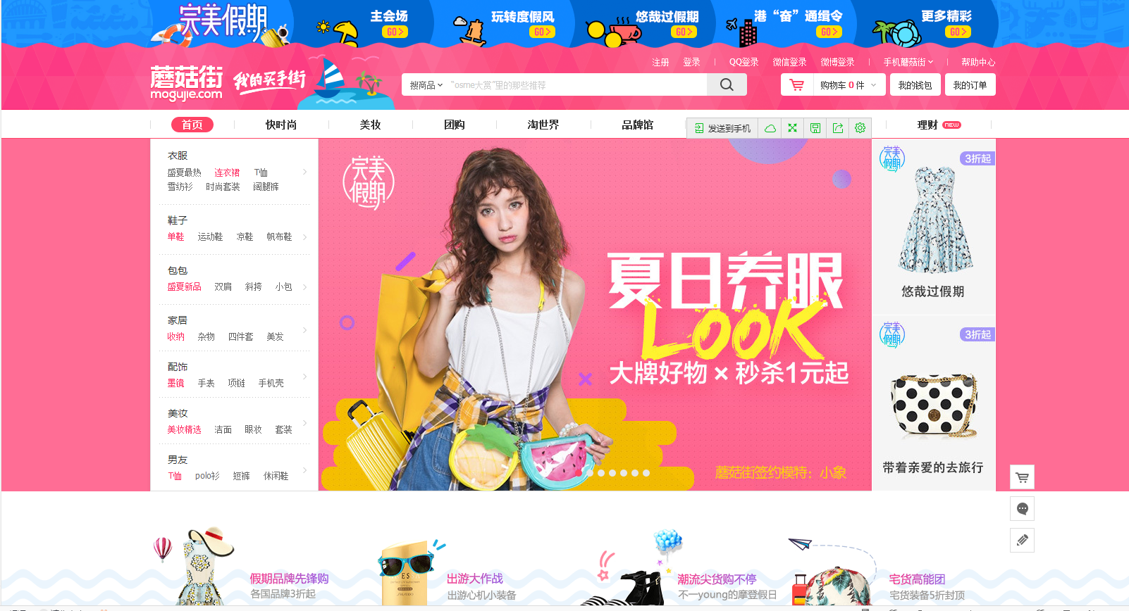蘑菇街是目前國內最大的女性分享導購網站,網頁設計大多選用暖色調為主體色彩,而粉色最為主要的設計色調之一,給人以清新、自然、溫暖地感覺,很大程度上勾起人們的購物欲望,希望能面向用戶群擴大。