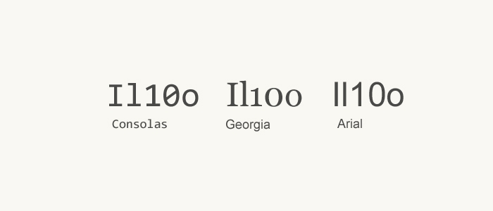在Arial字體中,i,l 的辨識(shí)度很低,而且當(dāng)有連續(xù)的il等較窄文字出現(xiàn)時(shí),文字難以選中。此外Georgia中,字母o,與數(shù)字0 只在大小上略有區(qū)別,基本上分不清,很難做到一目了然。由此可見(jiàn),等寬字體受字母本身的干擾較小,字母大小固定,密度固定,此類字體,簡(jiǎn)單容易辨認(rèn),大大提升了閱讀效率。