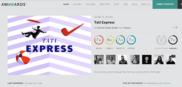 Awwwards不只是一個展示網(wǎng)頁設(shè)計的網(wǎng)站,它邀請一些有地位的設(shè)計師、博客和機(jī)構(gòu)組成一個多學(xué)科的評審小組對設(shè)計師的網(wǎng)頁設(shè)計進(jìn)行評分,大家可以查看獲獎?wù)呒氨惶崦说淖髌?,Awwwards也會舉辦會議來嘉獎那些對網(wǎng)頁設(shè)計做出貢獻(xiàn)的獲獎?wù)?,它也會幫助相關(guān)機(jī)構(gòu)發(fā)布招聘信息。與此同時,Awwwards還擁有自己的網(wǎng)上商店用于售賣網(wǎng)頁設(shè)計相關(guān)書籍。