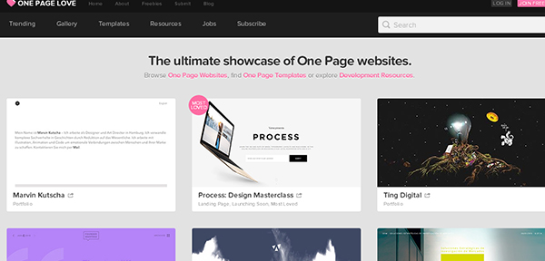 One Page Love網(wǎng)站值得所有從事網(wǎng)站設(shè)計的設(shè)計師收藏,它一個提供海量單頁模版展示和素材資源的網(wǎng)站,是網(wǎng)頁設(shè)計師尋找靈感和獲取精美網(wǎng)頁設(shè)計較好的站點,該網(wǎng)站于2006年成立,成立至今一直都發(fā)展的很好,截止到目前已收錄30多種行業(yè)分類的模版。
