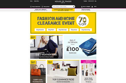 隱藏式菜單在電商類網站中的作用是非常重要的,巧妙的利用隱藏式菜單能夠清理電商網站雜亂的版面,最初它們是為移動端設計的,但現在也越來越多用在桌面端的設計中。2015年,許多在線銷售商在大大小小的屏幕上都使用了隱藏式導航菜單,節省了大量屏幕空間,這個趨勢在2016還會持續增長。如今,互聯網中很多知名在線商城都使用了隱藏式菜單,如:House of Fraser。