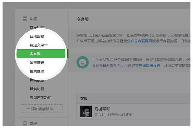 在7月1日后仍未手動升級的舊版多客服的用戶,公眾平臺將自動為其升級到新版網頁功能,舊版多客服將失效。自動升級的用戶,需要登錄微信公眾平臺,在“功能 - 客服功能”頁面中,為客服帳號綁定對應的客服人員微信號,綁定后才可使用網頁版客服功能進行客服服務。