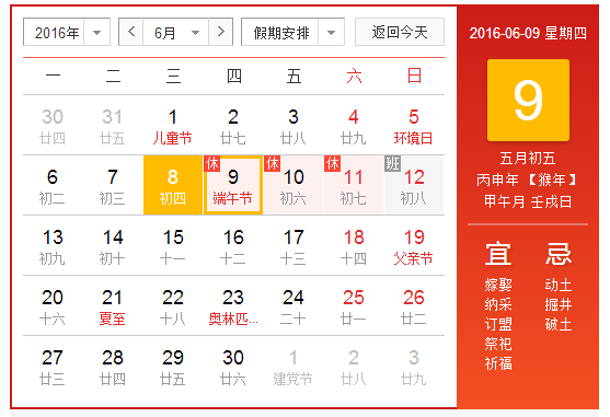 2016年6月9日(周四)至6月11日(周六),為放假時(shí)間,為期三天,6月12日(周日)正常上班。
