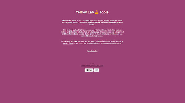 Yellow Lab Tools 是 Ga?l Métais 開發的一款新型網頁效能及前端質量測試工具。此工具給你大量信息及一些在其他工具無法看到的獨特功能,例如頁面加載時 JavaScript 與 DOM 互動和其他程序代碼驗證問題。