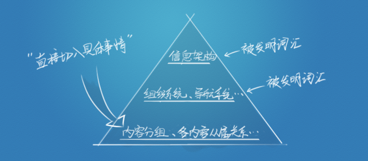 比如在上圖中,信息架構(gòu)、組織系統(tǒng)、導(dǎo)航系統(tǒng)等都是復(fù)合程度較高的詞匯,而它的底層實(shí)質(zhì)上是在做“內(nèi)容分組”,“分配各個(gè)內(nèi)容的從屬關(guān)系”這些具象的事情。