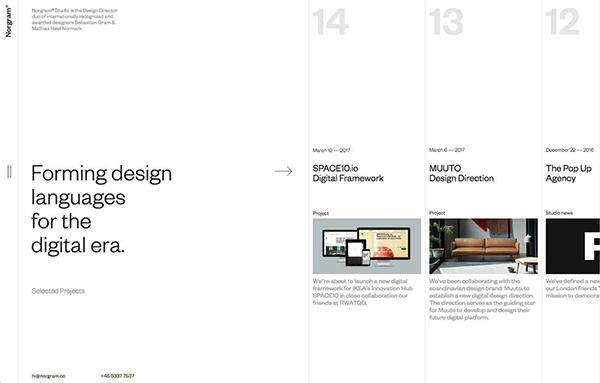 當你⑴次瀏覽一個采用水平滾動導航的網站時,體驗起來可能會覺得非常的奇怪,首先它的物理和視覺運動方向和常規(guī)的縱向滾動不同,而且當你使用鼠標滾輪滾動的時候,這種交互的錯位感會極其強烈。其實,想要解決這個問題,需要設計師加入視覺線索來幫助用戶導航,強化瀏覽邏輯和體驗即可。