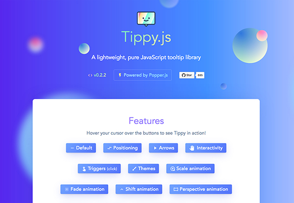 Tippy是一款輕量級的純JS工具提示庫,其中包含了大量不同的交互相關的提示內容,它的出現對設計師的工作有很大的幫助,并且它的兼容性非常的好,幾乎可以適用于任何瀏覽器,這也使得它幾乎可以輕松實現各種各樣的提示效果。